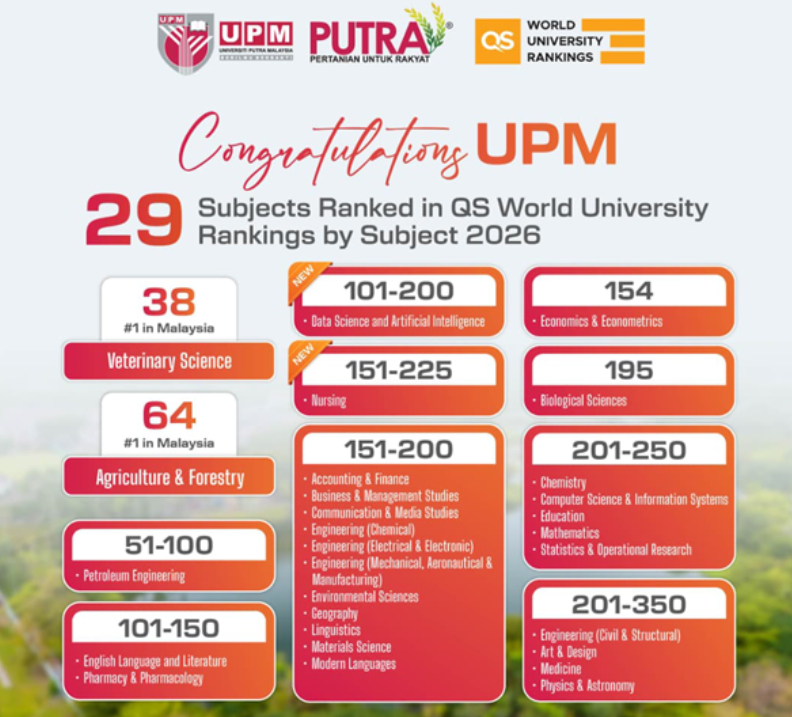 2026年3月25日——马来西亚博特拉大学(UPM)共有29个学科跻身于2026年夸夸瑞利·西蒙兹世界大学排名(QS WUR)学科榜单,涵盖五大主要领域:工程学、自然科学、生命科学与医学、艺术与人文,以及社会科学与管理。其中,兽医学这一学科的表现尤为亮眼,连续五年稳居全球顶尖行列,位列第38名,充分彰显了其作为马来西亚第一学科的持续声誉,以及在亚洲地区连续三年位居前列的卓越地位。此外,农业与林业学科同样表现不俗,稳居全球前100名,排名第64位。这一成绩不仅巩固了该学科在马来西亚长达14年来的领先地位,更使其在本次排名中跻身亚洲前十。值得一提的是,UPM还取得了两项新突破,首次有两大新兴学科跻身全球排名。护理学位列全球第151至225名,数据科学与人工智能则位居全球第101至200名。这些成就表明,UPM在新兴领域的学术实力与研究水平已获得国际认可,契合全球需求,顺应科技与医疗行业的迅猛发展。在更广泛的学科领域中,博特拉大学继续保持积极势头,多个主要学科的排名均有所提升。艺术与人文学科从此前的第291名跃升至全球第252名,生命科学与医学学科从第158名上升至第154名,社会科学与管理学科则从第183名攀升至第170名。这些进步充分体现了UPM致力于提升教学品质、加强科研实力,并在国际舞台上贡献智慧的坚定决心,与学校力争在全球学术格局中保持持续竞争力的愿景高度一致。总体而言,UPM在2026年QS学科排名中的表现令人振奋,共有20个学科跻身全球前200名,高于去年的19个学科。此外,有7个学科排名实现显著提升,另有12个学科保持稳定,充分展现了UPM在国际舞台上的持续竞争力与综合实力。